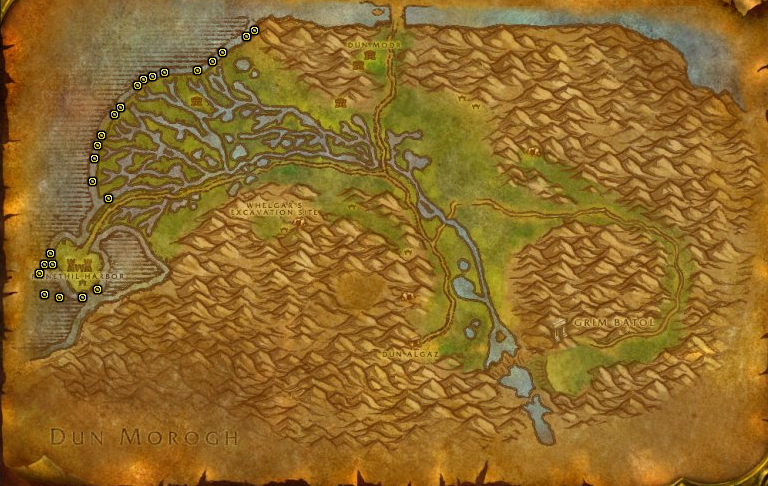 Pargo de lodo de 7 kilos -> Isla Bruma Azur - Teldrassil - Mulgore - Durotar - Claros de Tirisfal - Bosque Canción Eterna - Dun Morogh - Bosque de Elwynn.