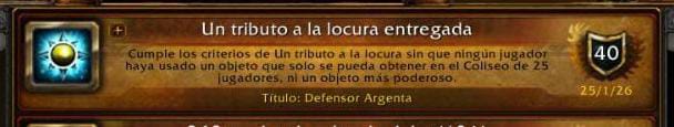 Nos complace presentar lo que al parecer son los primeros 10 logros obtenidos por realizar una contienda exitosa contra los jefes dentro de la banda Prueba del Cruzado en Modalidad 10j. Heroico, con equipo 245 y culminando con 50 intentos restantes (0 wipes) en fecha 25 de enero de 2026 a horas 02:31 hora servidor, obteniendo así, el logro de Un tributo a la Locura entregada 10j. y titulo "Defensor Argenta".