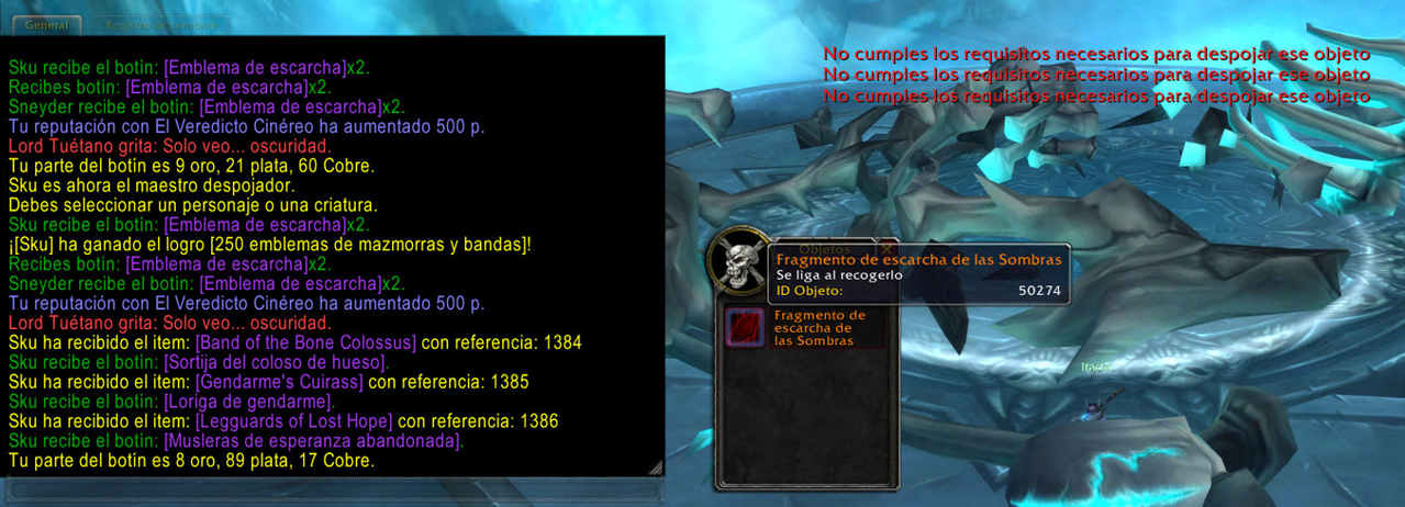 • El jugador designado para recoger los fragmentos debe verificar en cada jefe si se ha generado el objeto. Ten en cuenta que si el líder de banda o el master looter no pertenece a una clase elegible (Guerrero, Paladín o Caballero de la Muerte) y no tiene la misión activa, no podrá ver los fragmentos ni las sangres en los respectivos jefes.
