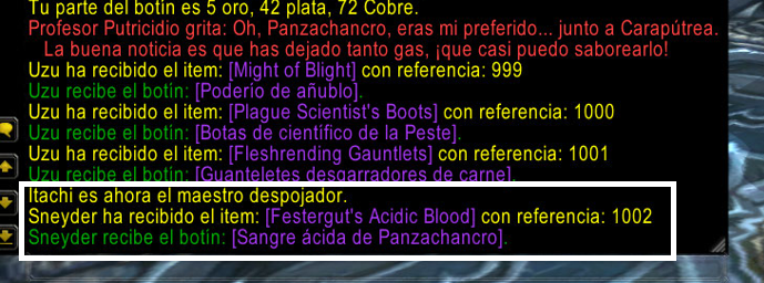 Inicialmente se habilitó la visibilidad general para lotear estos objetos mediante el sistema de master loot. Sin embargo, algunos jugadores y líderes de banda utilizan addons o macros para realizar el despojo automático. Aunque no recomendamos esta práctica —ya que puede interferir con la correcta recepción del botín— no está prohibida. Lo ideal es esperar unos segundos antes de lotear para asegurar que todos los objetos se generen correctamente.