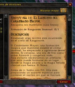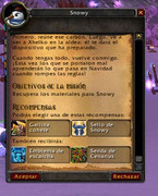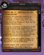 En la fecha tenemos misión doble. Por un lado, el muñeco de nieve nos va a pedir un item especial de evento para salvar la ecología de azeroth. Este item es brindado como recompenza de la segunda misión que nos brindará el NPC FIFI, una dranei que se encuentra en la fuente del area de los banquetes.