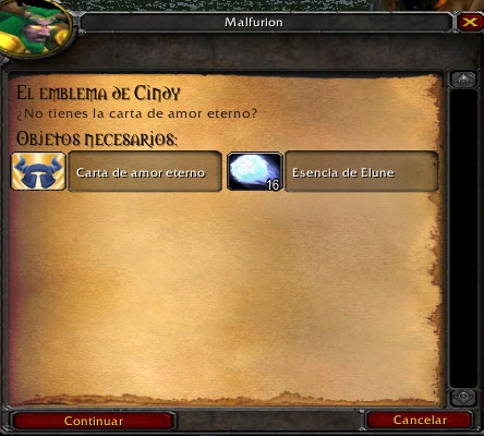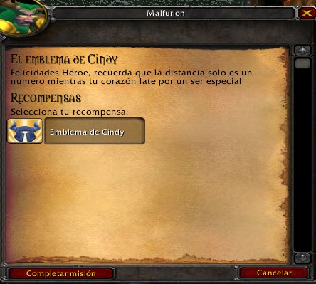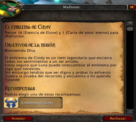 Luego de recibir la "Carta de amor eterno" vamos a tener que regresar al punto en donde se encuentra Malfurion y así poderle hacer entrega de la carta de su amada, esté nos completara la misión y nos entregara a cambio un Emblema de Cindy. Así podremos adquirir nuestras recompensas en el NPC Luna.