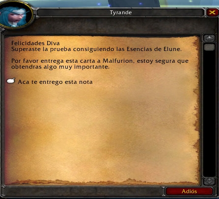 Al finalizar el recorrido encontraremos a Tyrande, ella nos entregara la "Carta de amor eterno" solo si tenemos las 16 Esencias de Elune de todo el recorrido.