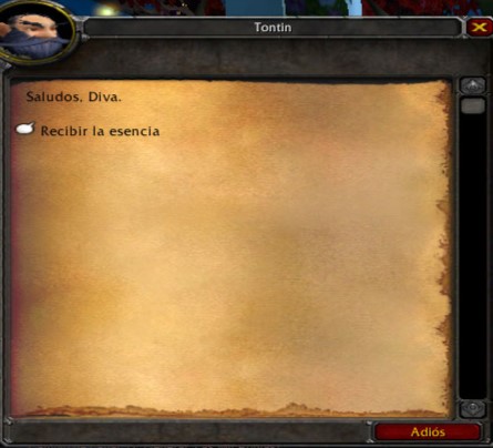 Tontín entrega las esencias por orden de posición, desde el inicio hasta el final del recorrido, cada vez que encuentres al npc te dará el menú con un mensaje "Recibir la esencia" para obtener la esencia de Elune