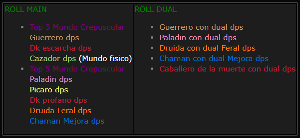 ESCAMA CREPUSCULAR AFILADA (Mele): Lotean los 3 primeros meles con una diferencia no mayor a 2k del Top 1 + el 1° Cazador de Fisico con un dps no mayor a 2k del top 1 de físico, Picaro Combate/Asesinato, Druida feral gato y Chaman Mejora y Paladin dps top 5 .Y Lotean con una diferencia no superior a 3k del primer dps en Mundo crepuscular.