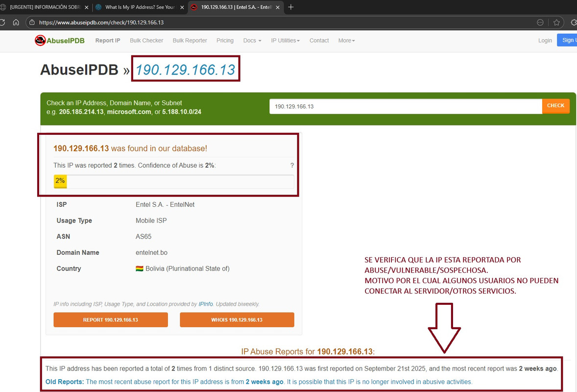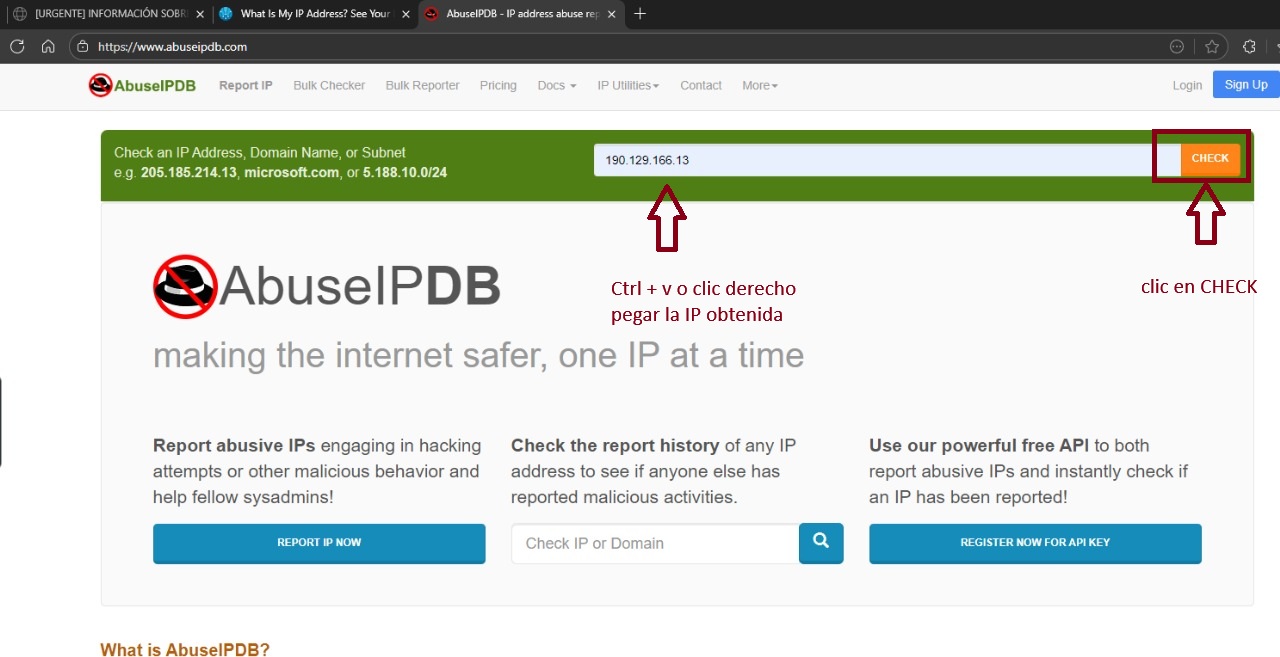 - Copia tu IPv4 (ej. 181.125.36.97) y pégala en: https://www.abuseipdb.com/