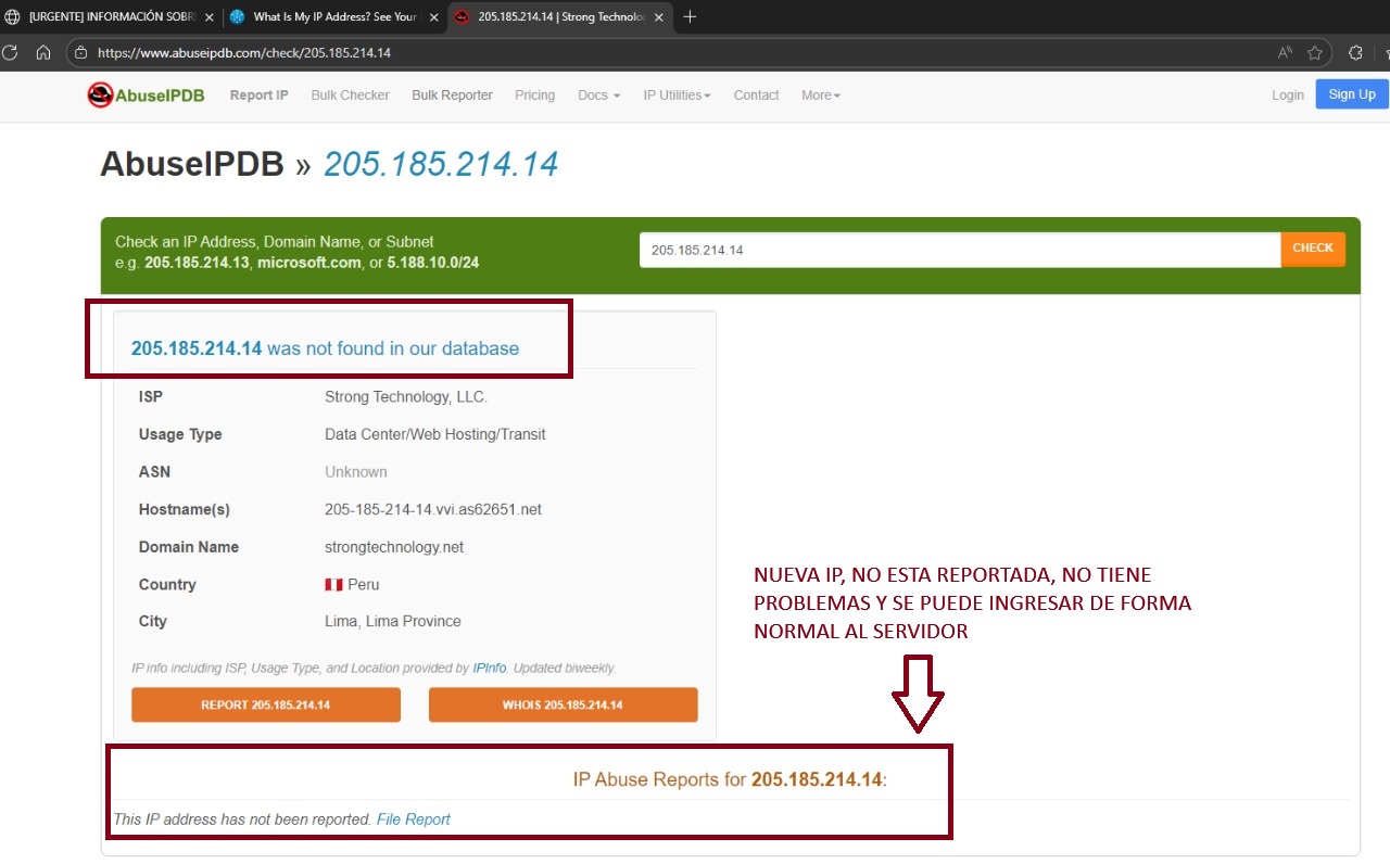 IMAGEN DE IP EN LISTA NEGRA Vamos a utilizar una IP de ejemplo reportada, para que vean que son los mismos pasos ![]() | IMAGEN DE IP LIMPIA SIN PROBLEMA O REPORTE IP que no presenta problemas, la revisión es la misma es solo como ejemplo ![]() |